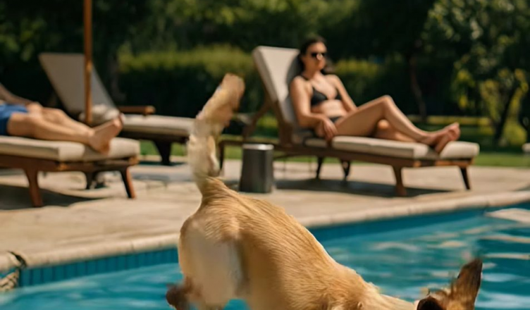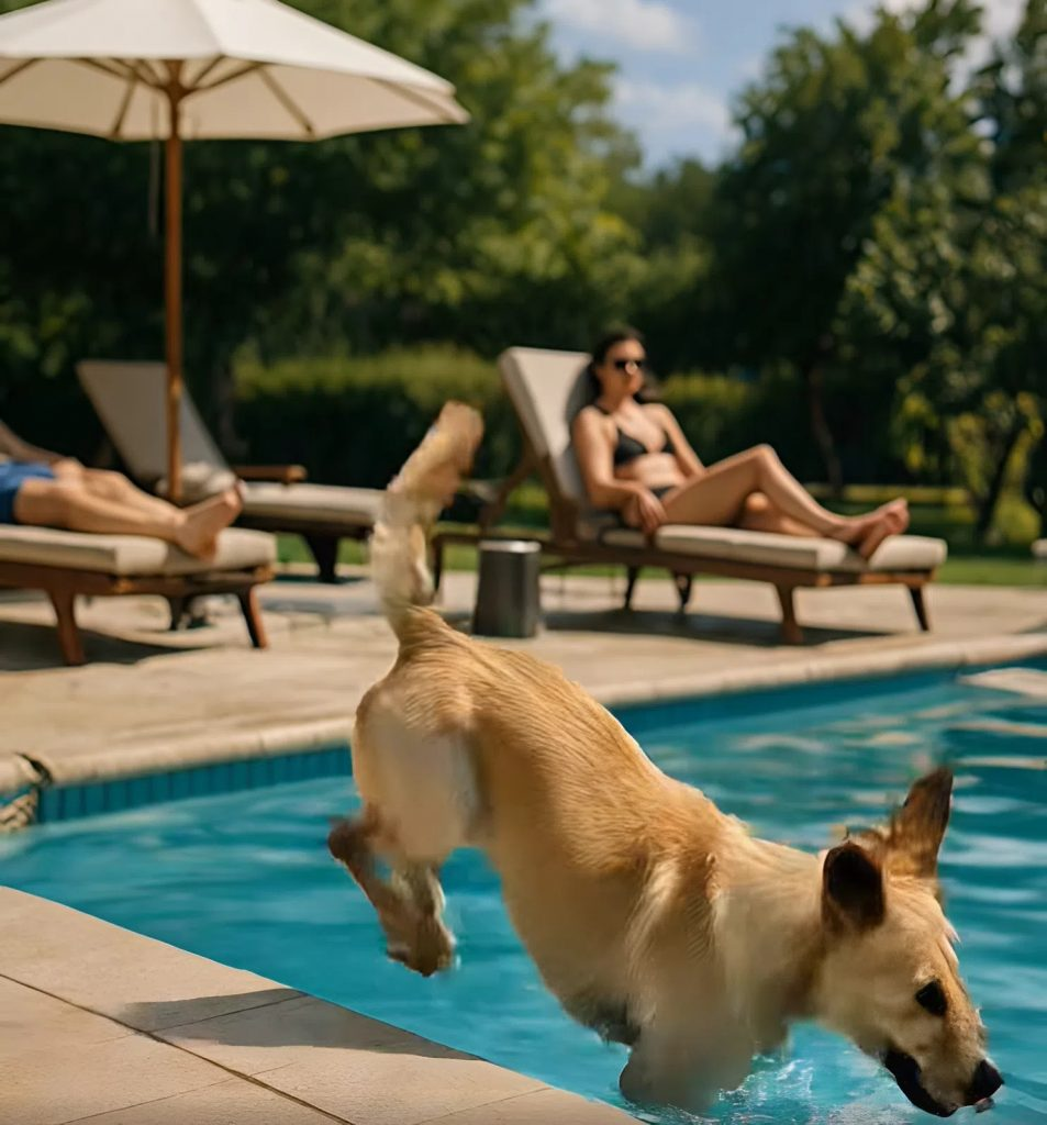 Rex s’est figé, oreilles dressées, regard pointé vers le bassin. Et sans attendre, il a pris son élan et a sauté dans la piscine.