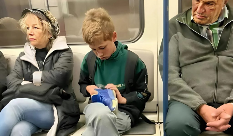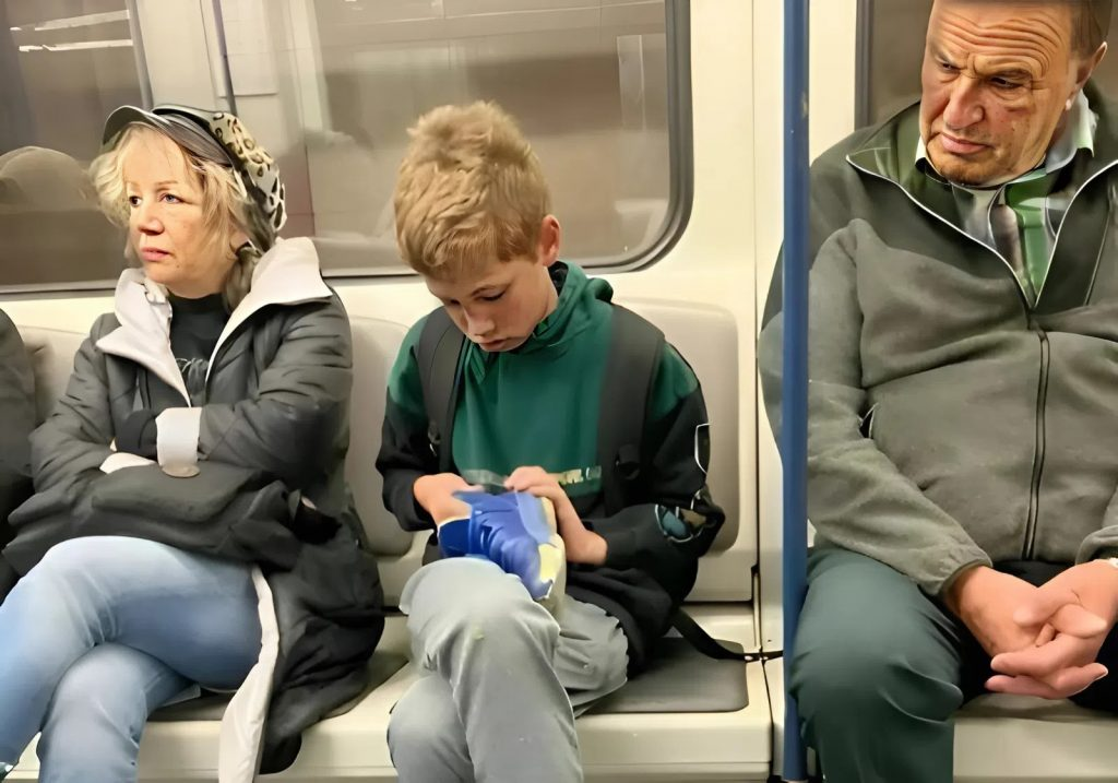À côté de lui, un homme en tenue de chantier : veste fluo, gants accrochés à la ceinture, bottes pleines de traces de ciment séché. Il observait le garçon depuis quelques stations, sans rien dire.