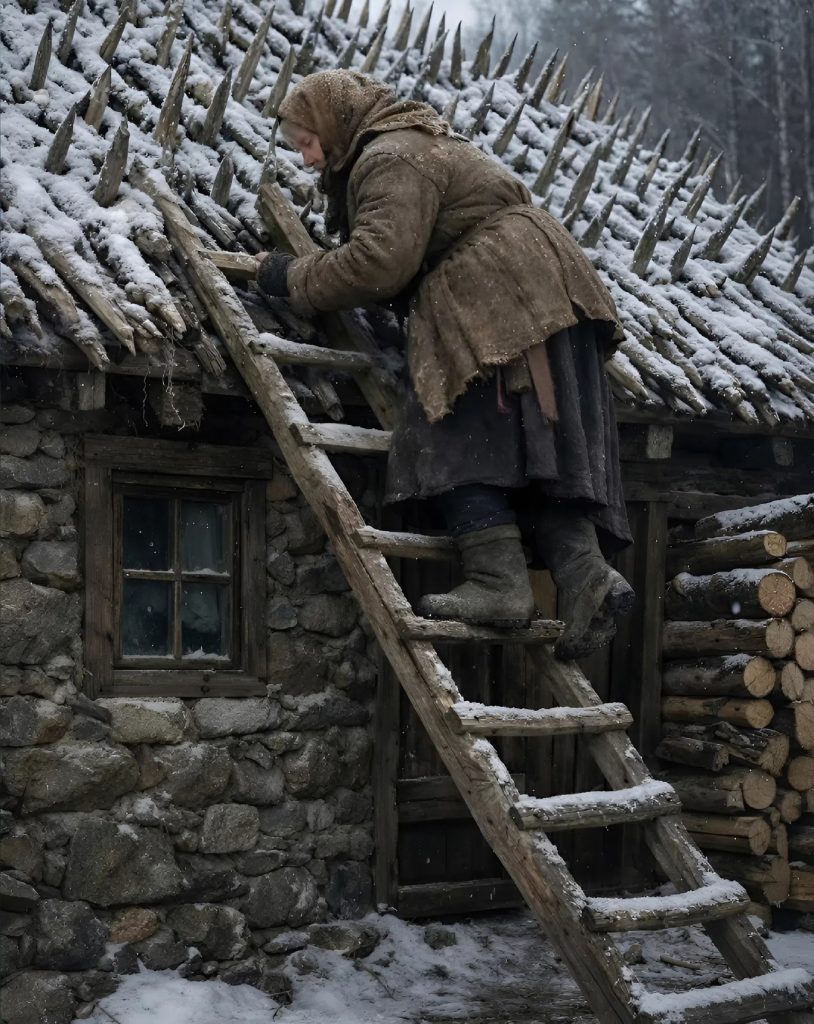 Chaque pieu était sélectionné avec soin. Le bois devait être parfaitement sec, dense, capable de résister à l’humidité et au gel. Elle mesurait, taillait, ajustait les angles avec rigueur. Elle testait la solidité de chaque fixation. Rien n’était improvisé. Elle connaissait sa toiture comme un artisan connaît son outil — les poutres fragiles, les points de tension, les zones exposées aux vents dominants.