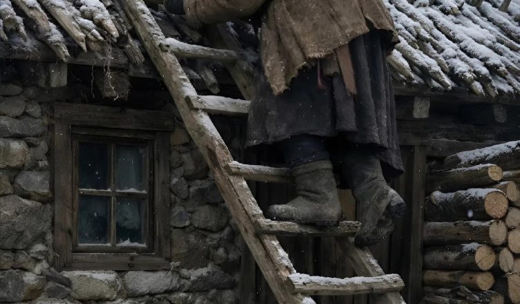 Sur la maison de la vieille femme, la neige ne formait pas de masse compacte. Les pieux en bois divisaient la couche blanche en segments plus petits. La neige se fragmentait, glissait entre les pointes et tombait au sol avant de devenir trop lourde. La toiture résistait.